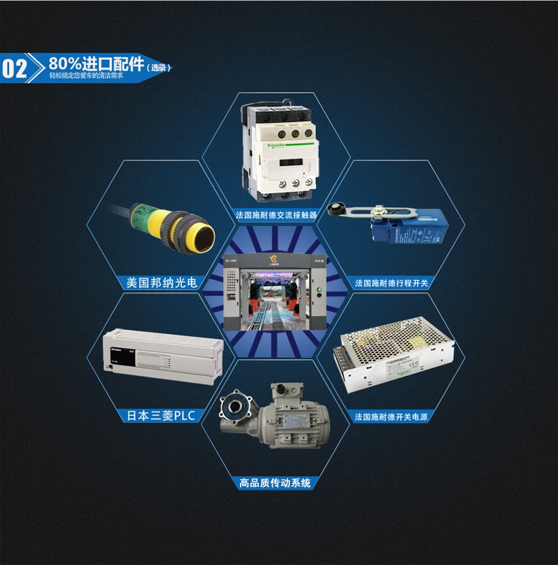 首先車輛駛?cè)胼斔妥瑨炜諜n,勿踩剎車,關(guān)好車窗 啟動洗車機,高壓沖洗兩側(cè)輪胎刷洗,進行泡沫噴淋車輛,跟進式頂刷大立刷對車身表面進行全方位清洗,風(fēng)干,本設(shè)備集高壓沖洗、自動泡沫、刷洗風(fēng)干、擦干拋光于一體的智能化洗車設(shè)備,整套設(shè)備全程采用電腦(PLC)為控制中心,毛刷清洗時自動感應(yīng),刷毛對車身產(chǎn)生的感應(yīng)電流值,從而控制毛刷與車身的距離,不傷車身;系統(tǒng)自動感應(yīng)所洗車輛長、寬、高度大小進行有效自動清洗 ,操作界面采用先進的觸摸屏控制系統(tǒng),全中文顯示,可實施人機對話,具有自動和手動的操控功能,操作簡單。該設(shè)備還具備故障自動檢測報警系統(tǒng)、車輛外型自動識別系統(tǒng)、故障排除方法顯示系統(tǒng)、洗車計數(shù)系統(tǒng)等。設(shè)計上采用多重保護措施,自動化程度高,可靠性強!主要電子元件均采用國際知名品牌,性能穩(wěn)定,故障率低。設(shè)計和工藝上采取多重安全保護,確保設(shè)備能長期正常運轉(zhuǎn)。其功能完全達國際先進水平!